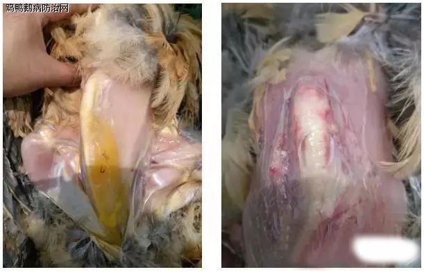 胸部肌肉消瘦,龙骨滑液囊出现大水疱,早期病禽的龙骨滑液囊内有淡黄色清亮的胶胨样粘液。