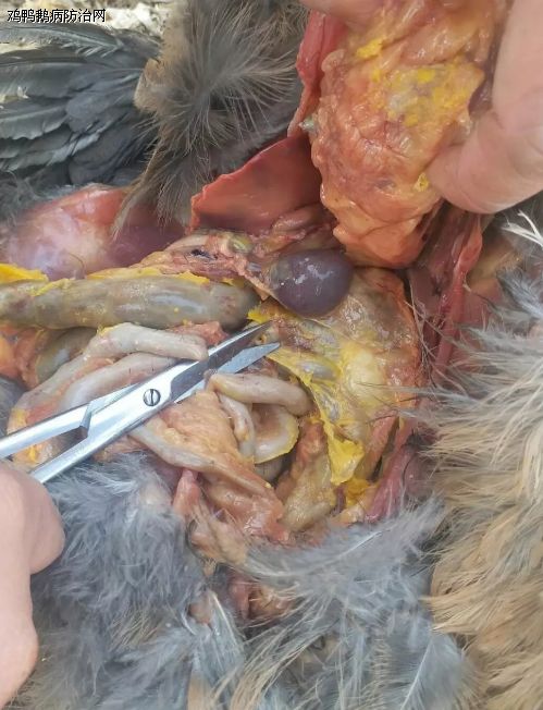 死亡鸡只解剖出现包心包肝、腹膜炎病变,更严重的鸡只出现气囊炎以及肺脏淤血、坏死病变,此种情况给当地养殖场造成了不小的损失。