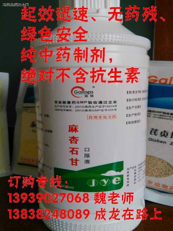 祛痰止咳。主要用于治疗由多种病因引起的呼吸系统感染、慢性呼吸道疾病及鸡传染性鼻炎等;对临床表现为咳嗽、气喘、张口伸颈呼吸、呼吸啰音、甩鼻、肿头流泪、流鼻液等症有特效;剖检可见喉头和气管黏膜充血、出血,鼻腔、气管、支气管黏性分泌物增多,气管黏膜增厚,气囊混浊、增厚、有干酪样渗出物等病变。