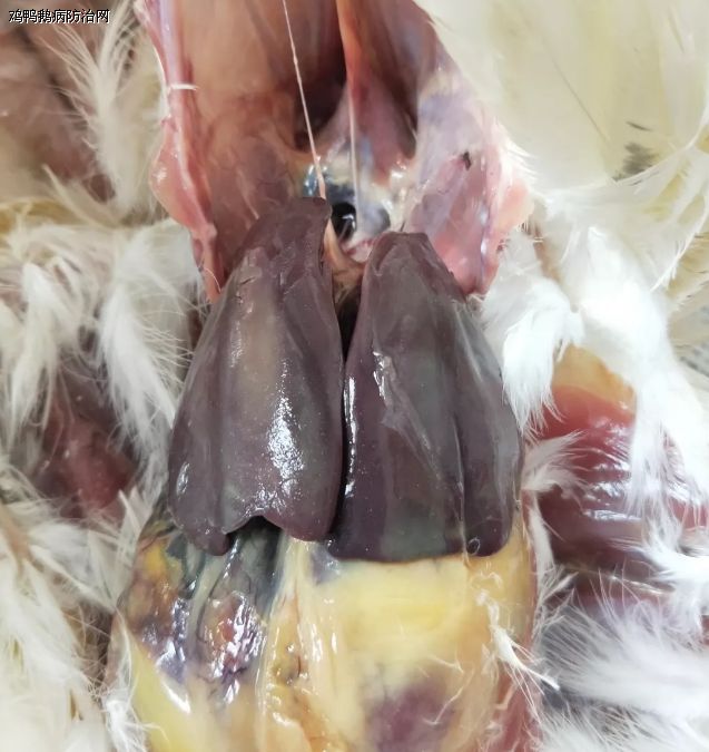 鸡冠发紫黑色、气管有弥漫性出血、肝脏紫黑色表面有黄白色渗出物包裹着、十二指肠剪开肠壁呈乌黑色,腹腔内有黄色结块,泄殖腔弥漫性出血、