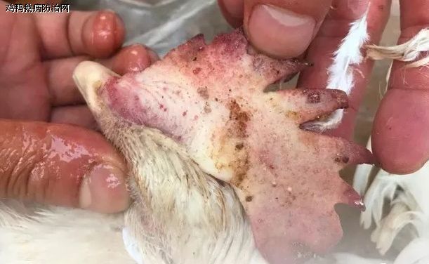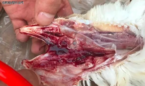 病死鸡的鼻腔出血,口腔内有明显血迹,有时出现鸡口腔,喉头,气管内有血痰或者血液。