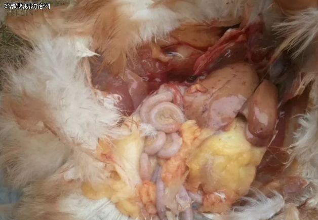 病例简介:发生在××鸡场,鸡场总存栏2万羽,发病1万羽,210日龄,产蛋率94%,3天前出现零星死亡,每天3-4只,期间以为是这几天温度高引起的中暑死亡,没有得到重视,现把病理解剖图片发出来供大家参考;
