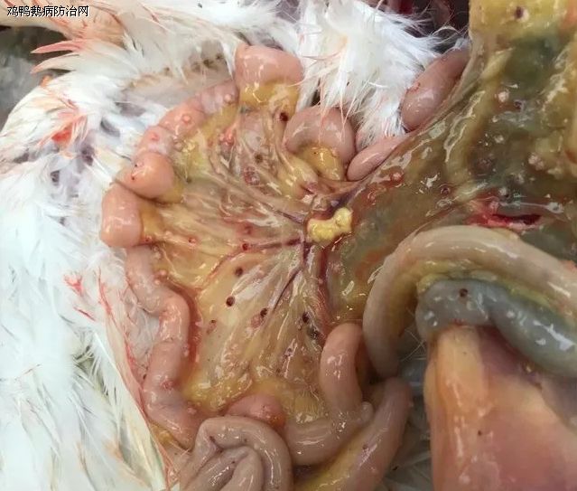 有时气管、胸腔、嗉囊、腺胃、肌胃及肠道也见有出血斑点。胸肌、腿肌等浅部及深部肌肉,以及肝、肺、脾等脏器常见到白色小结节,结节为针尖大或粟粒大,与周围组织有明显的界限。