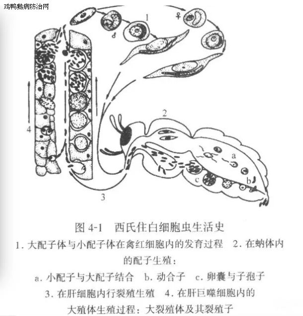 住白细胞原虫寄生于鸡的红细胞、白细胞等组织细胞中。卡氏白细胞原虫的发育需要库蠓参加,发育可分为裂殖发育、配子发育和孢子发育三个阶段。