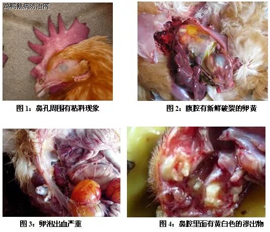 腺胃乳头有出血现象,胰腺边缘有灰白色的坏死点和出血点,腹腔有新鲜破裂的卵黄(如图2),(这个现象比较明显)卵泡出血严重(如图3),病程比较长的会出现腹膜炎、肝周炎,剖检鼻腔里面有黄白色的渗出物(如图4)。