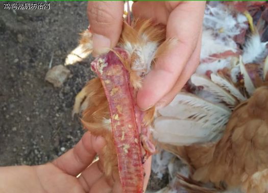 解剖症状:喉头片状出血,喉头和气管黏膜肿胀,粘液增多,并带有血液黏痰;胰腺有轻微出血,肠道淋巴集结轻微表现,卵泡充血;死亡鸡只胸部肌肉苍白,呈煮熟样;死亡鸡只脖颈伸直,脚爪伸直,在鸡笼中表面向上死亡,大群采食量逐渐减少至绝食。