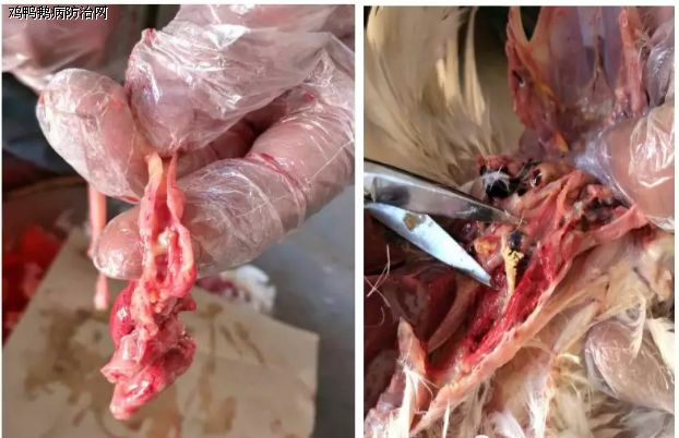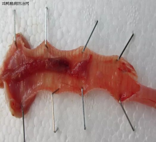 剖检发现:胸肌苍白而柔软;喉头到鸣管之间无变化,一级至二级气管出现黄白色栓塞,胸气囊、腹气囊比较清晰透明;腺胃乳头无出血变化,胃底腺有轻微出血(如下图所示)