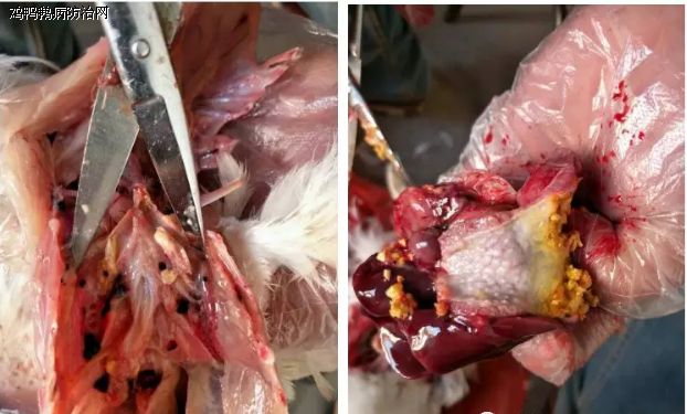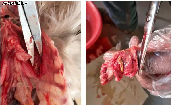 养殖户开始用原粉治疗四天,期间第一天死了8只,进行解剖支气管内有黄色纤维素样渗出物,一、二级支气管仍有黄白色栓塞,出现包心症状,胸、腹气囊出现黄色干酪样物质,还有部分肺部出现黄色干酪样物渗出,第二天死亡解剖出现细支气管也有小的黄白色栓塞,之后两天死亡率没有减少。(如下图所示)