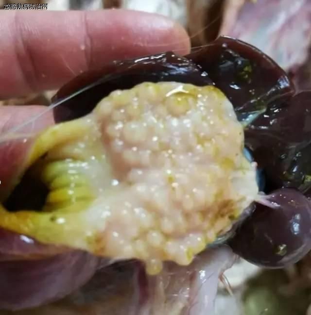 剖检症状:扯开胸部,在胸骨皮囊处有囊肿,切开内有奶油样或黄褐色干酪样渗出物。打开胸腔,肝肾颜色正常,体积缩小,盲肠扁桃体肿胀出血,肠道略显萎缩,在淋巴滤泡处有突出于表面的杏仁状肿块,肿块轻微出血,腺胃乳头水肿潮红,双腿跗关节外观微肿,有横纹状皱褶,剪开关节腔,有淡黄色渗出物。