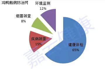嘉云健康2018年5月份服务了黑龙江、辽宁、河北、北京、天津、河南、山东、江苏等13个省份地区的养殖场。其中健康体检占65%,说明大部分养殖场已经对鸡群疫病预防控制有了高度的重视。检测项目比例见图1。