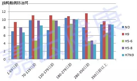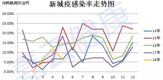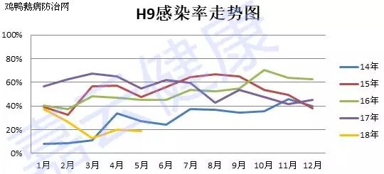 通过以上图可看出,与2017年同期相比,禽流感H9发病率呈下降趋势,新城疫呈平稳状态,疑似原因可能由于新城疫免疫多采用饮水方式,随着季节变暖,肠道性疾病增多,免疫效果大打折扣造成,所以建议养殖场免疫前注重肠道健康及饮用水清洁度。