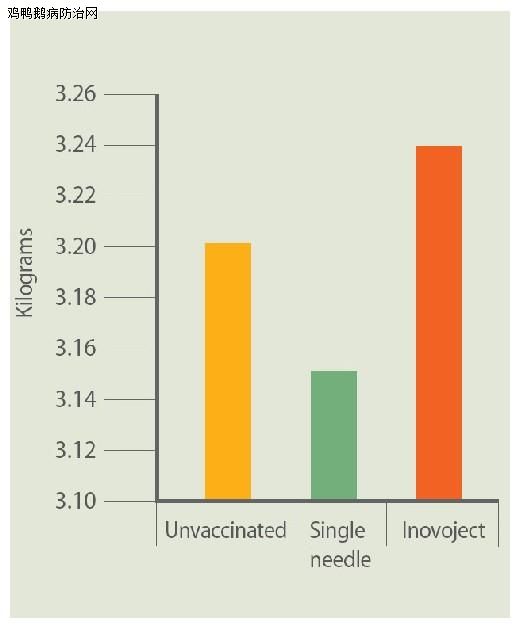 Barbosa博士还介绍了在巴西商业肉鸡孵化场进行的两个实际生产研究,结果双针借配接种系统与1日龄皮下疫苗接种相比效果更好一些。
