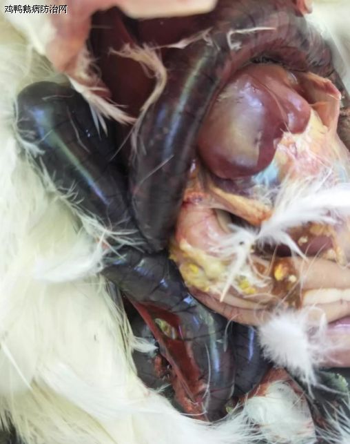 3、大肠杆菌和病毒(非典型新城疫、轮状病毒)表现为:大群基本正常,但采食量提高较为缓慢,粪便稀薄,严重的粪色发绿,内有未消化的饲料颗粒,剖检气囊充血有粘液,肝肿大,肠壁变薄,粪便内常见未消化饲料,腺胃有零星出血点,肠道淋巴滤泡肿胀,盲肠扁桃体肿胀出血,直肠有点状及条状出血,胸腺充血。