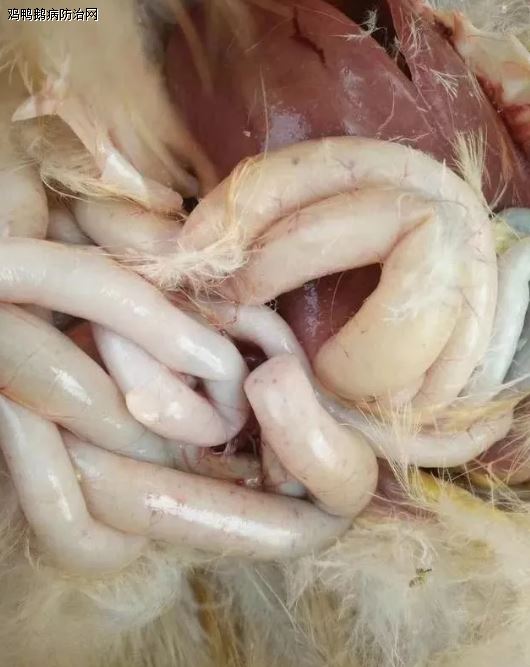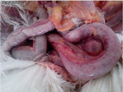 产蛋禽:产蛋迅速减少,发病率近100%,死亡率5-50%或偶尔高些。腺胃水肿,有时充血,胰腺边缘有充血,十二指肠肠系膜血管充血,十二指肠黏膜充血、出血、水肿明显,外观紫红色,内有血性粘液,肠黏膜脱落后见溃疡;盲肠黏膜有斑块状或条状白色附着物。