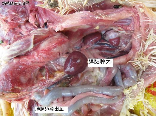 剖检变化:呼吸道粘膜亮白出血,腺胃基部有出血带,肠道出血,卵泡坏死,输卵管内有肉样炎症。