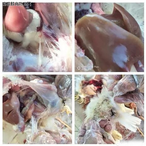 腹气囊浑浊有大量气泡,有的卵黄没吸收好,肝脏发青有白色坏死点。