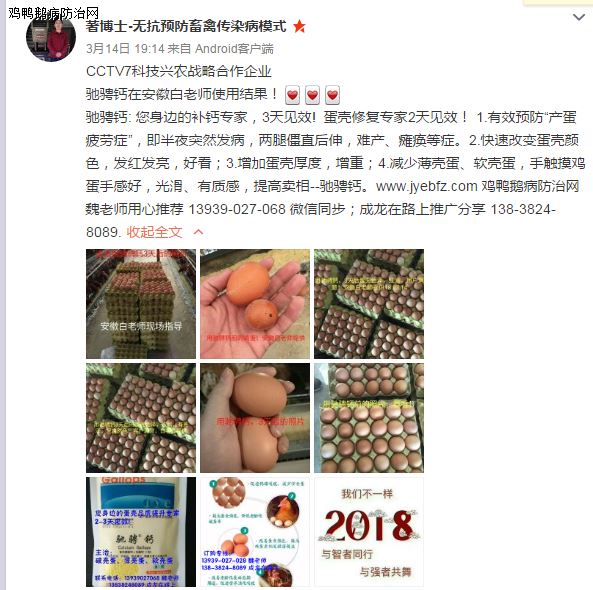 驰骋钙:您身边的蛋壳品质提升专家,2天见效! 1.有效预防“产蛋疲劳症”,即半夜突然发病,两腿僵直后伸,难产、瘫痪等症。2.快速改变蛋壳颜色,发红发亮,好看;3.增加蛋壳厚度,增重;4.减少薄壳蛋、软壳蛋,手触摸鸡蛋手感好,光滑、有质感,提高卖相--驰骋钙。www.jyebfz.com 鸡鸭鹅病防治网 魏老师用心推荐 13939-027-068 微信同步;成龙在路上推广分享 138-3824-8089.