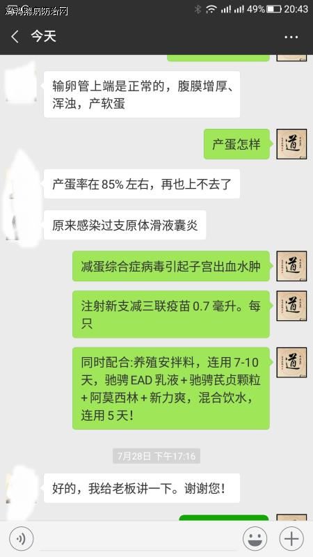 驰骋芪贞颗粒+好得快+新力爽饮水,连用4~5天,病情得到控制后,用养殖安+驰骋EAD乳液+生命核能快速恢复产蛋率。