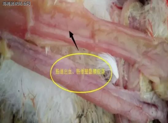 1、肠道黏膜脱落、空肠和回肠极度扩张,充满液体,十二指肠粘膜表面覆盖一层黄白色恶臭的纤维素性渗出物和坏死的肠粘膜。
