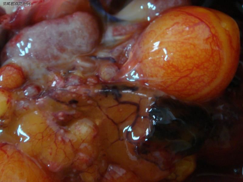 剖检可见腹腔内有大量蛋黄或灰黄色炎性渗出物,肝脏表面覆盖一层黄色或浅黄色纤维素性渗出物,肠管互相粘连;部分腹腔积有蛋黄凝块,有时这种凝块可达到拳头大小;卵巢中卵泡变形、变性、变色,有破裂的卵泡。病毒性疾病引起的卵黄性腹膜炎,会有相应的病理变化;细菌性疾病引起的卵黄性腹膜炎,腹腔有腥臭味。