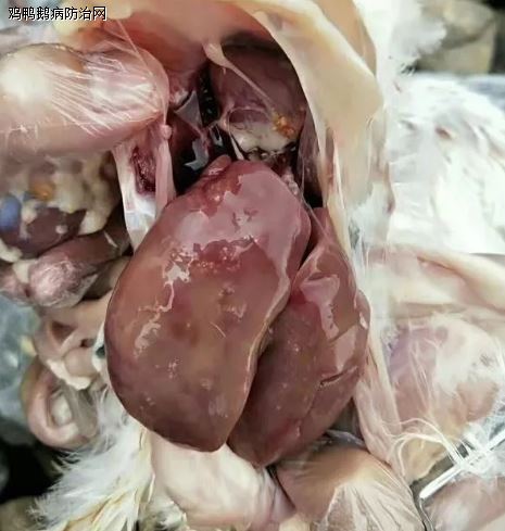 肝脏上有坏死点,脾脏出血,腺胃壁变薄坏死,肌胃萎缩有溃疡。