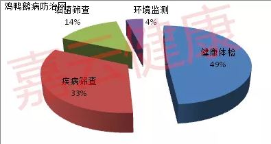 驰骋健康2018年11月份服务了黑龙江、辽宁、河北、北京、天津、河南、山东、江苏等13个省份地区的养殖场。其中健康体检占49%,较10月份的44%上升了5%;病毒筛查和细菌筛查分别占33%和14%,较10月份呈相对持平状态,提醒广大养殖场应在入冬前提前做好各种疾病的防控工作。检测项目比例见图1。