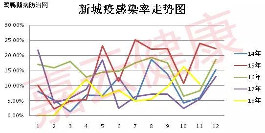 新城疫发病率在2018年整体上处于历史低位,只是在4月份间和10月份间有两个小高峰,根据以往几年的曲线图可以看出,11月份后都会反弹上扬,所以现在也不能马虎大意,除了加强日常管理和隔离消毒外,抓紧监测新城疫抗体,根据抗体的高度和均匀度,及时补免和调整免疫程序。