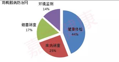 《鸡鸭鹅病防治网》联合嘉云健康8月份服务了黑龙江、辽宁、河北、北京、天津、山西、陕西、山东、江苏、云南等13个省份地区的养殖场。7月和8月疾病较稳定,以健康体检为主,占44%;病毒筛查和细菌筛查分别占25%和17%。各检测项目所占比例见下图。