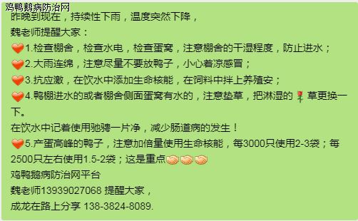 昨天晚上到现在一直在下雨,养殖场注意抗应激,在饮水中添加生命核能,在饲料中添加养殖安。特别提醒:鸭子、鹅在下雨时间,最容易喝到比平时更多的脏水与泥土,引起肠道病多发,后期造成零星死淘率高。所以晚上睡觉时或现在,就在饮水桶中或饮水管道中添加驰骋一片净,每1000只鸭子、鹅使用3-4片,根据实际情况而定!鸡鸭鹅病防治网平台 成龙在路上提醒大家