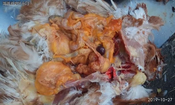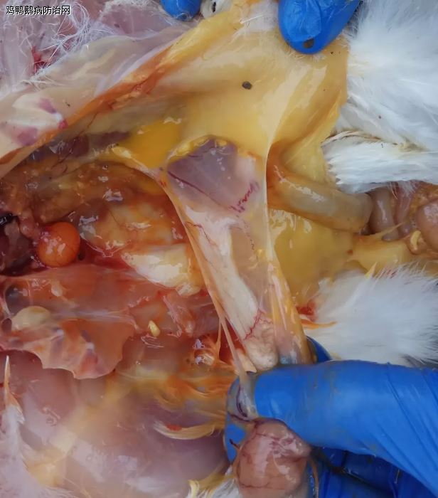 值得注意和提醒地方,这里强调以下;IB在高发病态势已经持续将近两年时间,很多雏鸡感染IBV后,在开产时候出现的“假母鸡”,这些鸡群已经到开产中期和后期,就有问题了;什么问题?由于“假母鸡”卵巢照常发育,输卵管不发育的特点,使开产几个月后,会有大量的“假母鸡”因几十个卵黄脱落到腹腔形成无菌型“卵黄性腹膜炎”;这些“卵黄性腹膜炎”(如图1)会导致这些鸡群在产蛋后出现较高死亡率。