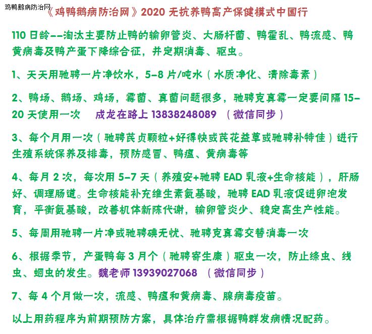 经常中药养殖安或驰骋补特佳+生命核能拌料;来减少肠炎发生,使用发酵中药微生态制剂--养殖安,或者是微生态制剂驰骋补特佳拌料来调整肠道菌群平衡,提高饲料转化率,增加体质,更减少氨气产生;蛋鸭、种鸭15-20天饮用驰骋克真霉3-4天,很有必要(杀灭霉菌孢子、治疗真菌病,效果就是不一样!)。