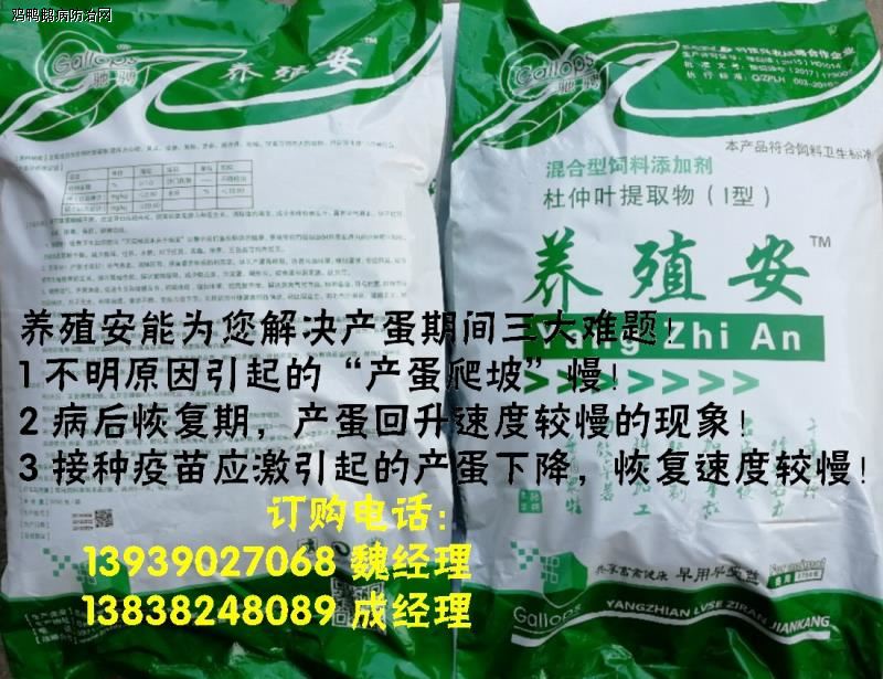 中药汉方+微生物保健---养殖安I(绿色自然健康,无抗养殖首选)-高效复方杜仲提取物+嗜酸乳杆菌+枯草芽孢杆菌+酵母菌(含酵母细胞壁)+益生元(寡糖),国家一类新型功能性添加剂。家禽根源性保健, 解除肝胆负担,彻底摆脱肠道疾病的困扰!优化蛋鸡产蛋性能,增加蛋重。让鸡变的不再难养!养殖安是畜禽肠道保护专家;家禽与水禽的肠道有两大功能,一是消化功能,第二就是免疫功能。肠道功能不好的话,那么免疫功能也就不存在了。正所谓“皮之不存,毛将焉附”。不采取措施缓解应激效应、维护动物的消化道功能,势必会出现健康等问题,抗生素的使用也就在所难免了。实际上,如果能够做到减少动物的应激,改善动物的消化道功能,是可以做到不用或少用抗生素的,这是我们通过众多的科学研究和生产实践所证实的结论。事实胜于雄辩!