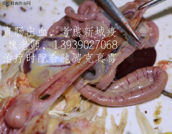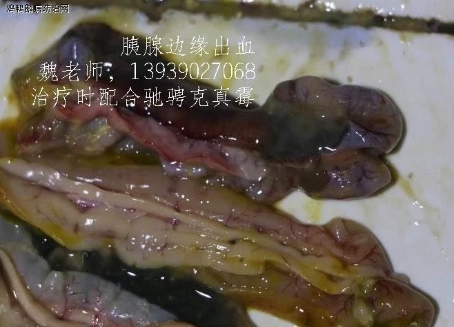 解剖病死鸡可见,包心包肝,胰腺边缘出血,直肠轻微出血;