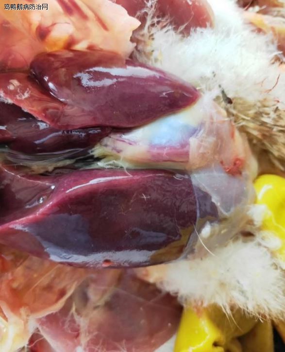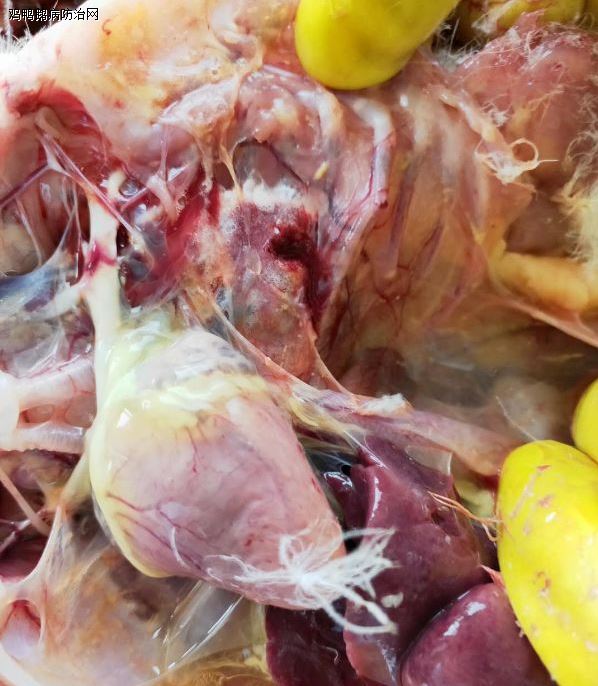 心肌柔软无弹性,心肌上可见明显的虎斑心,肝脏极度肿大,质脆。腹水明显,胸气囊混浊,腹腔内有大量黄色积水。