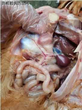 解剖病鸭发现其脾脏肿大明显,肝脏有淤血,表面有针尖状白色点状坏死。卵巢发生出血、萎缩、破裂,输卵管有粘液等眼观变化。