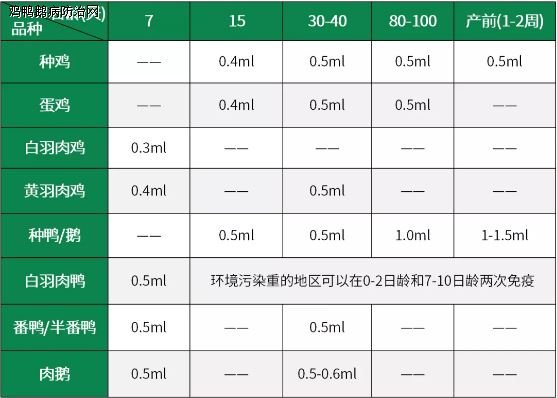 不同品种、不同饲养周期禽群,应制定合理的免疫程序并执行,确保基础免疫完善和及时补免。种禽群建议开产前免疫4次,商品产蛋禽群建议开产前免疫3次,已开产的禽群可根据抗体水平、免疫间隔时间(2-3个月)加强免疫,商品肉禽根据饲养日龄免疫1-2次。