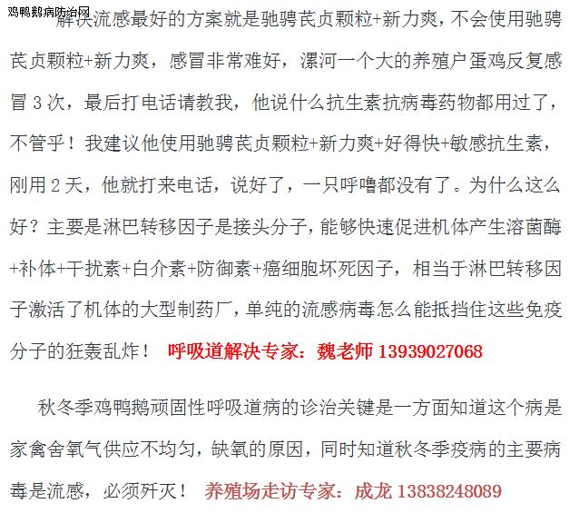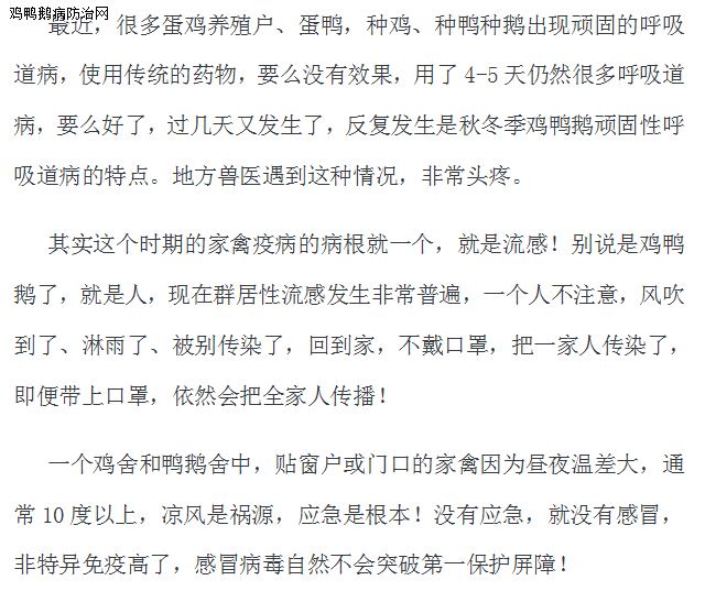 秋冬季鸡鸭鹅顽固性呼吸道病的诊治关键是一方面知道这个病是家禽舍氧气供应不均匀,缺氧的原因,同时知道秋冬季疫病的主要病毒是流感,必须歼灭!