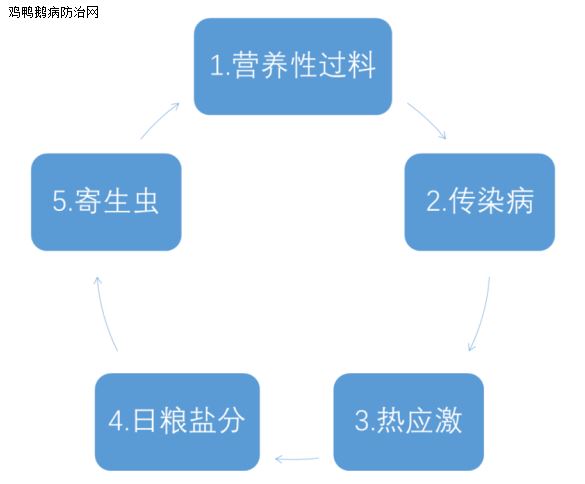 1.营养性疾病引起的“过料”: 比较明显的特征是:粪便呈桔黄色,成形度差。发病鸡着色差、饲料转化率低、体重低、群体均匀度差。临床表现:常见腺胃、肌胃和小肠损伤。主要原因是饲料蛋白能量比过高,导致未消化的成分较多,同时多数专家学者认为与谷物中的某种未知毒素或谷物质量差有关。维生素A缺乏等营养性疾病,主要引起嗉囊和食道损伤,也会引起“过料”。