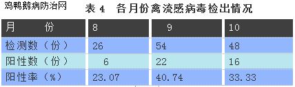 秋、冬、春季是禽流感的高发季节,但禽流感的发病受养殖习惯的影响,5-10月份是水禽育雏的高峰,因此5~10月份水禽禽流感的发病率比较高。气候突变、冷刺激、饲料中营养物质缺乏和其他高应激性刺激均能促进禽流感的发生。禽流感常与大肠杆菌病、传染性浆膜炎等混合感染而加重病情, 造成死亡率增加。研究所8、9和10月份禽流感病毒检测阳性率分别为23.07%、40.74%和33.33%,禽流感病毒发病率较高。