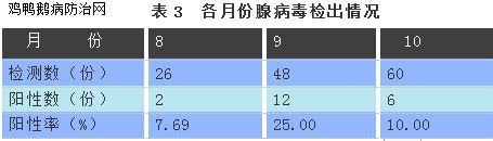 8-10月份腺病毒检出率为14.9%,8、9和10月份腺病毒检测阳性率分别为7.69%、25.00%和10.00%。核酸测序结果显示,主要为鸭腺病毒3型,病毒变异较小,腺病毒分离株与已报道的鸭腺病毒3型毒株核苷酸同源性均为100%。