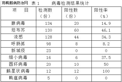 检测结果显示,腺病毒、黄病毒(坦布苏)、流感检出率较高,均高于10%,说明这些病在养殖场感染相对较多。鹅星状病毒、细小病毒、圆环病毒的检测量虽然不高,但是检出率较高,应引起重视,由于养殖场饲养管理水平不一,对于疫病的防控更应加强。