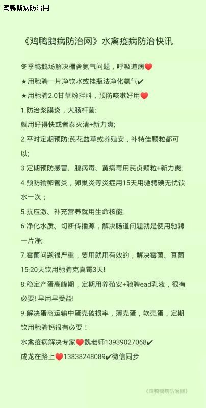温馨提示:初冬时节、早晚温差大、防寒保暖很重要,同时不忘通风,请做好疫病预防管理工作,重视黄病毒、禽流感的防控,冬春季是鸭鹅产蛋下降、脾脏坏死、黄病毒、副粘病毒、浆膜炎等烈性传染病病的高发期,不可不防,近期产蛋下降、脾脏坏死、霉菌毒素流行泛滥。注意种鸭鹅产蛋下降、禽流感、黄病毒等水禽常见病的防控方案:养殖安+驰骋芪贞颗粒+新力爽+驰骋EAD乳液,混合饮水或拌料,每 月1-2次即可解决!防控禽流感、黄病毒效果就是不一样!水禽疫病实战专家魏老师提醒各位养殖朋友,防控黄病毒不可麻痹大意,要认真对待。 ‘