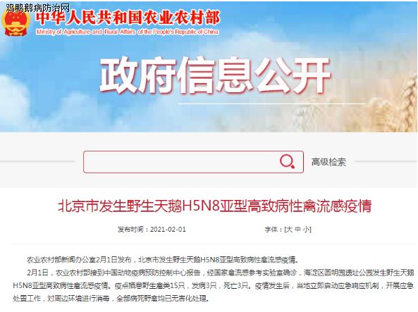 2月1日,农业农村部新闻办公室发文称,北京市海淀区圆明园遗址公园发生野生天鹅H5N8亚型高致病性禽流感疫情。