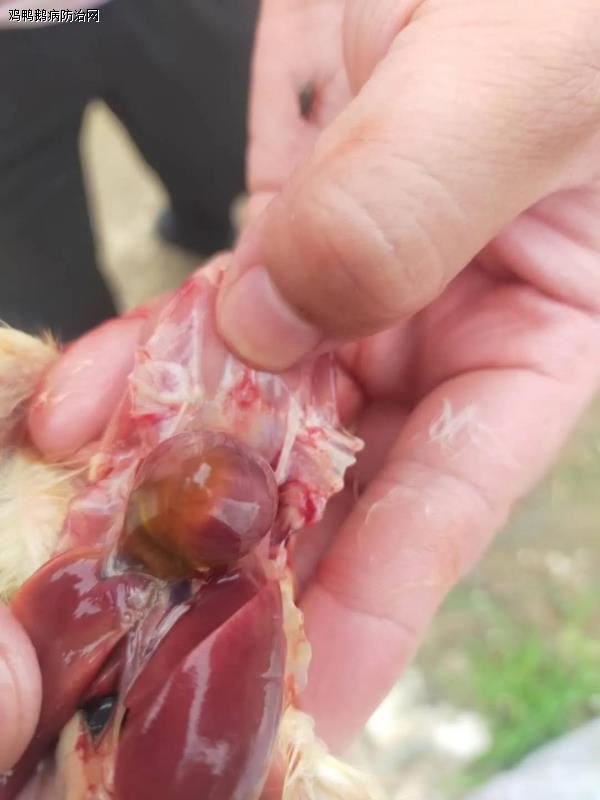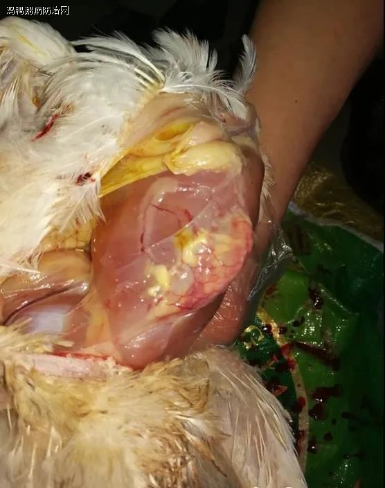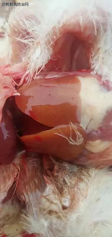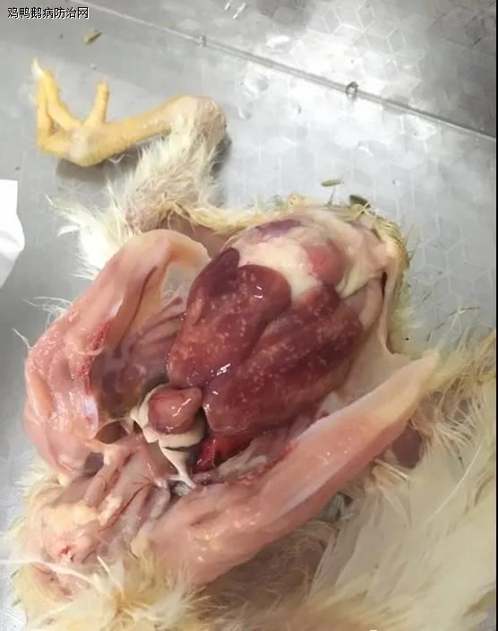 心包内有大量的透亮、淡黄色的渗出液蓄积,蓄积量可以多达 5-20m L。心脏松弛柔软。死亡的鸡肾脏普遍肿大呈花斑状,疑似肾型传支的病变。有的肺脏水肿。有的病例腺胃有出血点,肌胃与腺胃连接处靠近腺胃一侧有一出血带。腺胃乳头有分泌物,胰腺潮红,卵巢充血。肝脏轻度肿大,色泽变淡。质地变脆,肝脏表面有出血点。