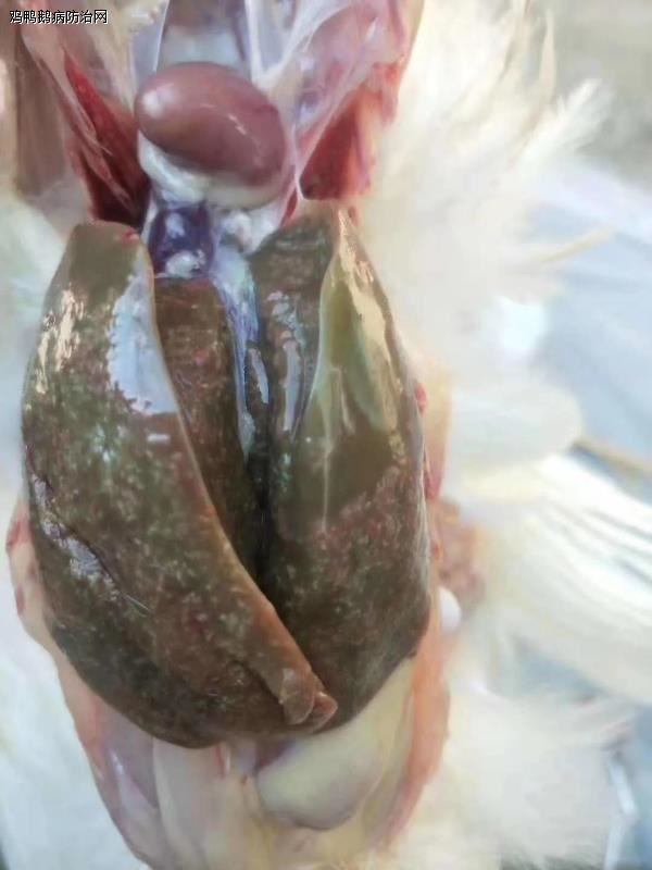 禽伤寒是由禽沙门氏菌感染发病,各日龄鸡均易感,最急性病例由于病禽迅速死亡,常见不到明显的病理变化。而在急性或慢性病例中可见肝脏变成淡绿棕色或古铜绿色,肝脏表面有时有灰白色米粒状坏死点,胆囊肿大充血
