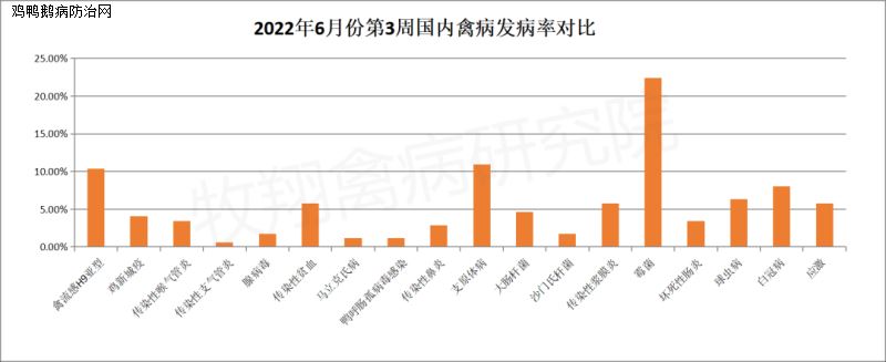 本周霉菌性疾病的发病率为22.41%,比上周增长了3.46个百分比。霉菌性疾病的发生主要与饲料、饮水、天气、鸡舍湿度有直接关系,在日常饲养管理中可定期饮用驰骋克真霉,净化体内霉菌,杀灭真菌,清除毒素、及时清理水线、夜晚使用风机降低鸡舍湿度,可以有效减少霉菌性疾病的发病率。