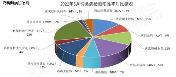 《鸡鸭鹅病防治网》禽病研究院通过对5月份禽病检测阳性率情况进行分析,帮助家禽养殖从业者了解国内疾病流行现状,同时也对下半年家禽养殖过程中疫病风险进行预测把控。