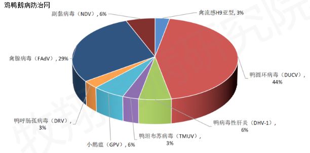 根据5月份水禽送检病料检测结果分析,鸭圆环病毒检出率最高,其次是腺病毒,这两个病原检出率占73%。