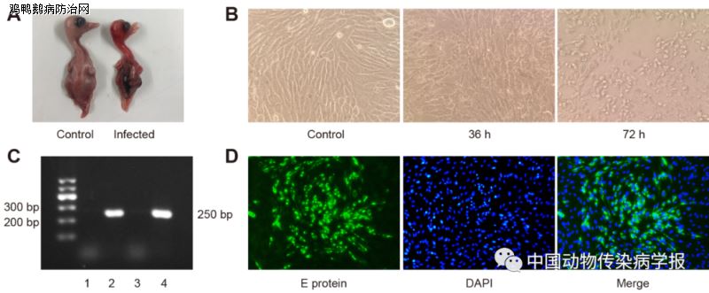 作者在临床研究中发现感染鸭坦布苏病毒的鹅群表现出明显的神经症状,同时伴随着精神沉郁、厌食、共济失调等症状。随后,通过鹅胚和BHK-21细胞成功分离到1株鹅源鸭坦布苏病毒,将其命名为DTMUV/Goose/China/2019/AQ-19 strain。