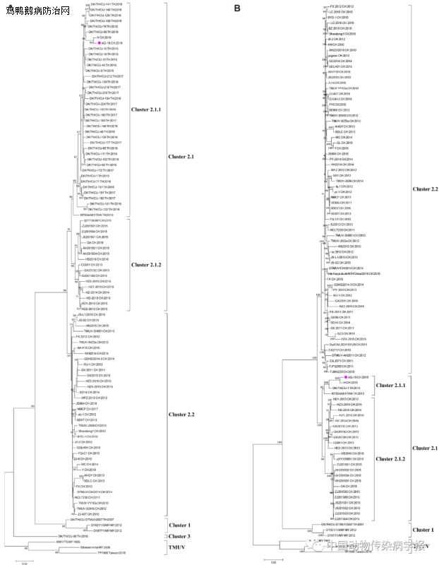作者简评:此研究表明,我国鸭坦布苏病毒具有较高的遗传多样性和变异快速性,在中国首次出现了一种在鹅群中传播的新型强毒力的鸭坦布苏病毒。后续进一步研究这种新型鸭坦布苏病毒的致病性和宿主范围显得尤为重要。